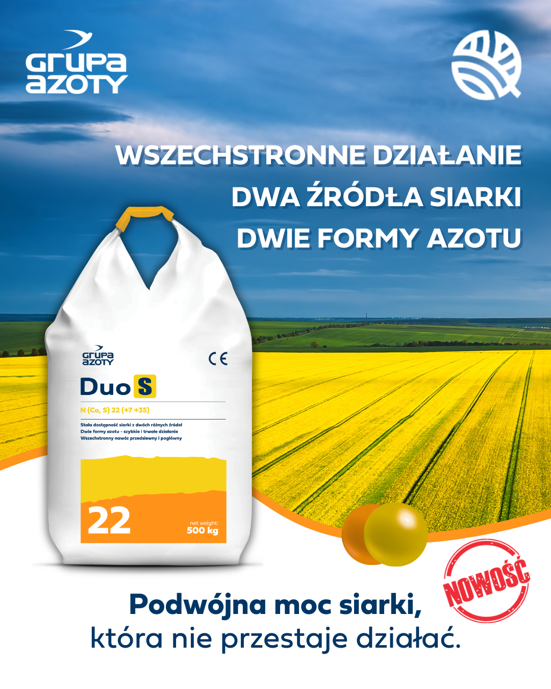 W ramach realizacji tych założeń Grupa rozszerza portfolio o nowy nawóz azotowo-siarkowy z dodatkiem wapnia – DuoS®. Produkt wpisuje się w trend zwiększania efektywności wykorzystania składników pokarmowych oraz ograniczania strat związanych z wymywaniem i niestabilnością form azotu i siarki.